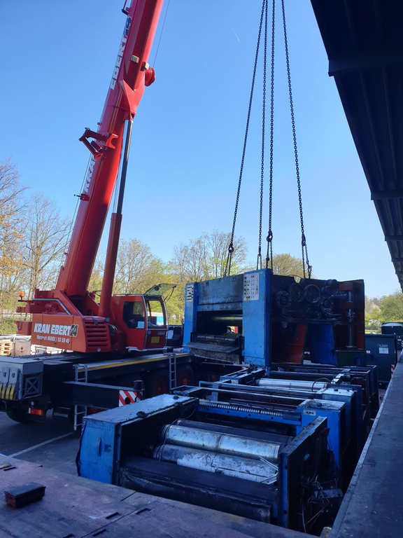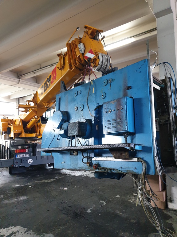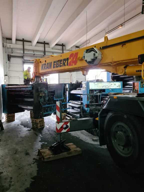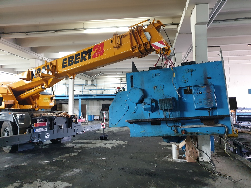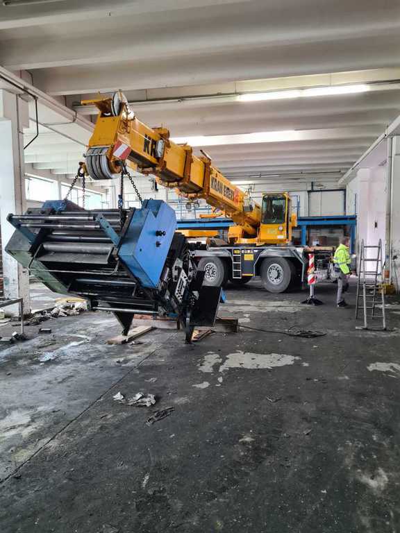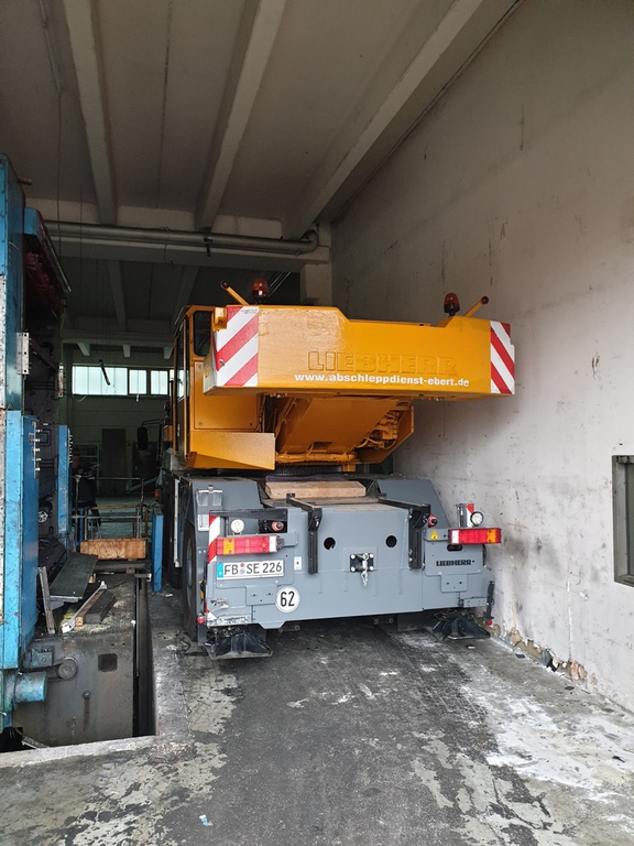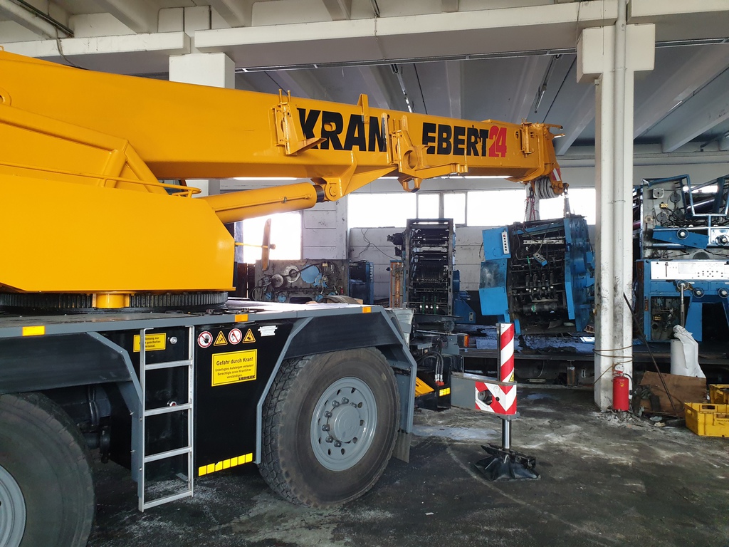 Hier wurde eine 700 to schwere Druckmaschine demontiert und mit unserem 40 to Autokran in Einzelteile mit Stückgewichten von ca. 17 to zerlegt. Bei diesem Projekt gab es mehrere Herausforderungen. Da die Maschinenhalle nur über eine 1,5 m hohe Rampe anfahrbar war, musste eine Plattform aus Schwerlastpaletten und 40mm starken Stahlplatten gebaut werden. Um den unebenen Boden vor der Rampe auszugleichen, war es ein notwendig eine ebene Tragschicht aus Sand und Kies herzustellen. Auf die Rampe wurde später ein 36 to schwerer Kran mittels zwei weiterer Autokrane gehoben. Insgesamt war die Maschinenhalle, durch das 2,6 m breite Einfahrtstor und durch die Anordnung der Betonstützen in der Halle, sehr beengt. Hierfür ist unser allradgelenkter 40 to Hallenkran optimal geeignet. Die zu demontierende Anlage bestand aus Modulbauweise d.h. die Maschinenunterteile sind in einer Grube im Hallenboden verankert, worauf die Oberteile montiert werden. Aufgrunddessen stand nur eine sehr geringe Hubhöhe zwischen Maschinenoberkante und Hallendecke zur Verfügung. Die mittels des 40 to Autokrans demontierten Maschinenteile wurden auf Schwerlastrollen abgestellt und mittels eines 8 to Staplers auf die Rampe positioniert. Von dort wurden die Maschinenteile für den Abtransport mit einem 100to Autokran verladen.