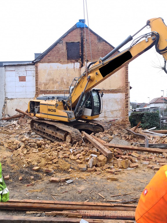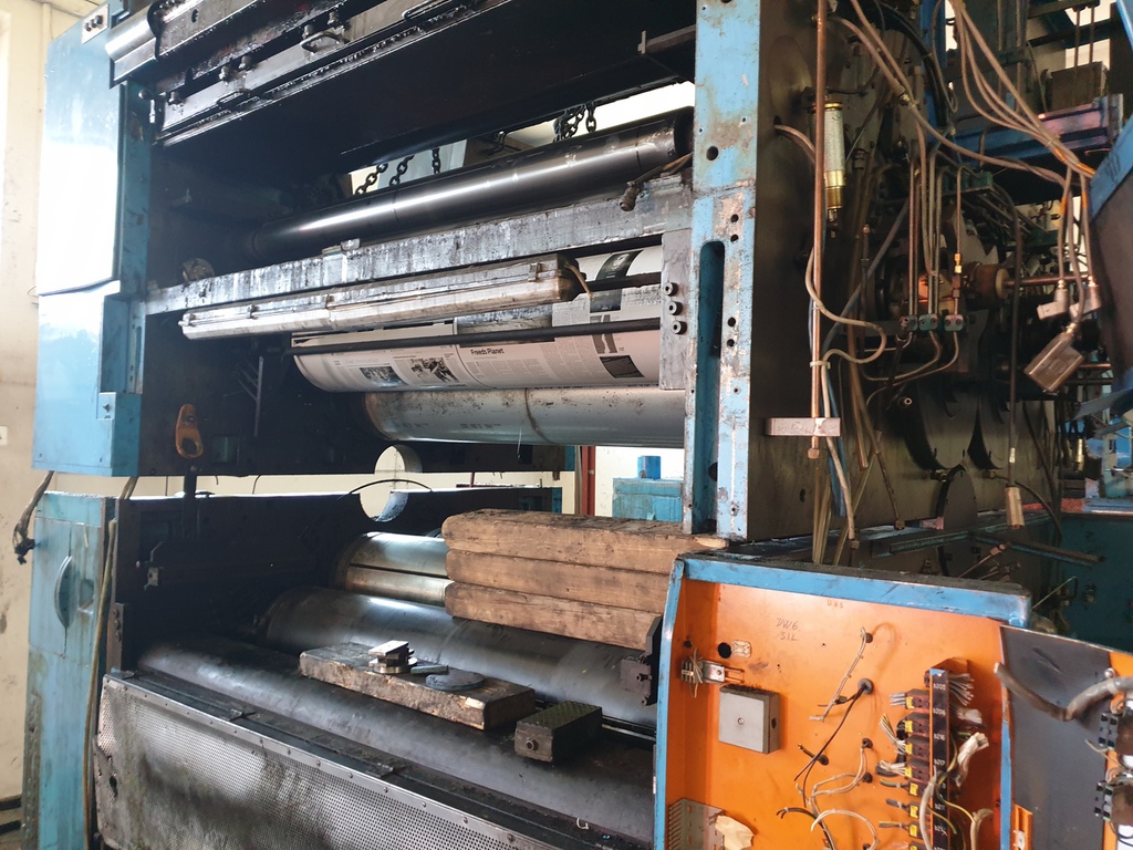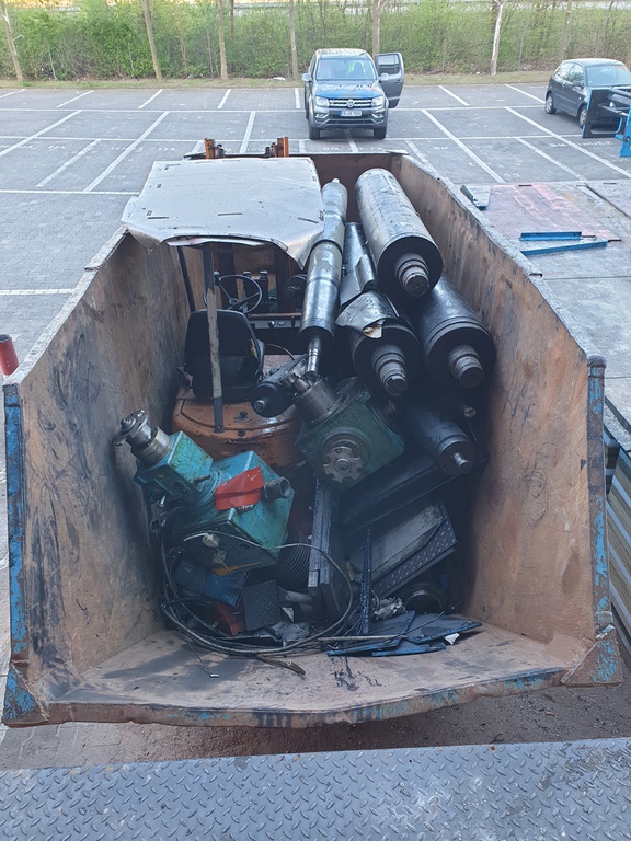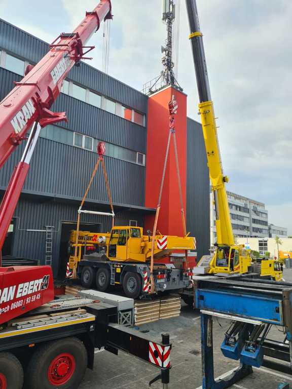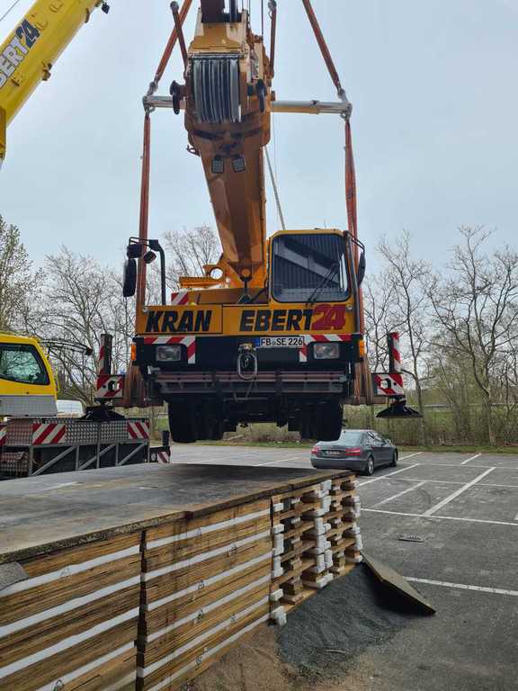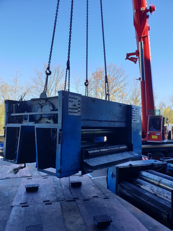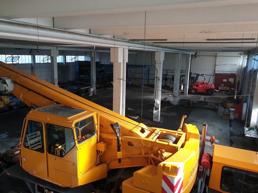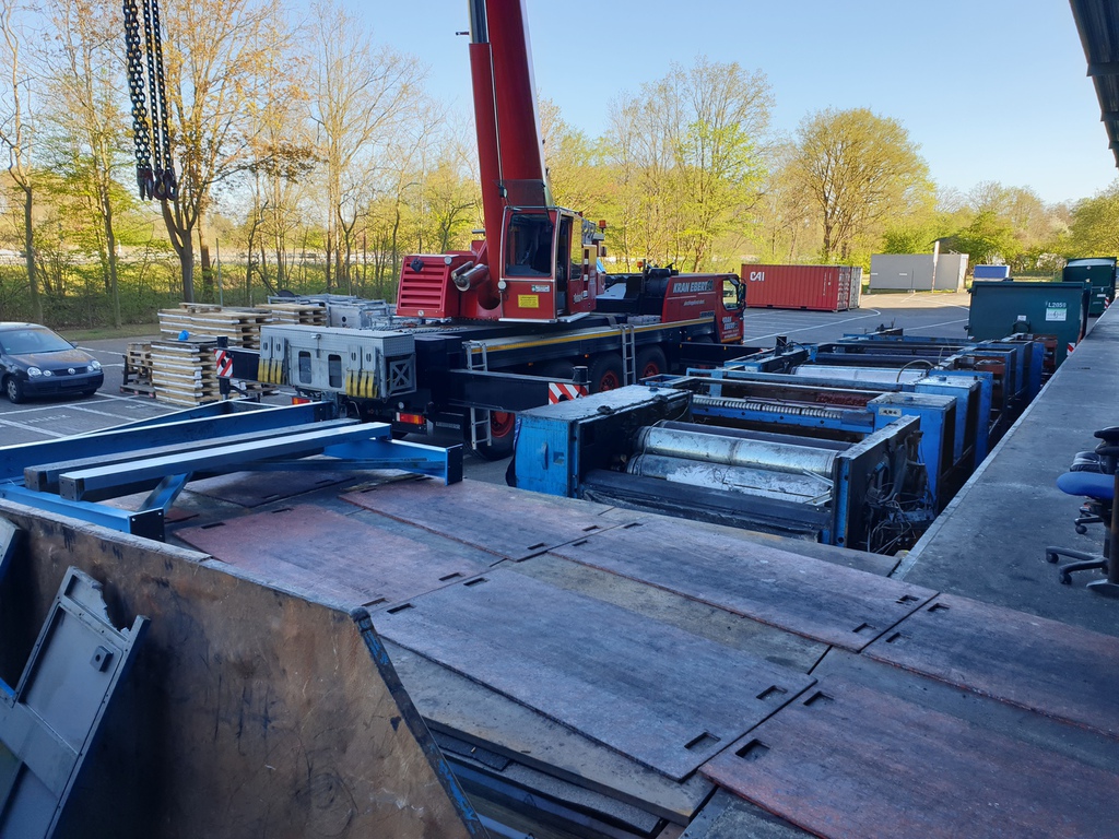 Hier wurde eine 700 to schwere Druckmaschine demontiert und mit unserem 40 to Autokran in Einzelteile mit Stückgewichten von ca. 17 to zerlegt. Bei diesem Projekt gab es mehrere Herausforderungen. Da die Maschinenhalle nur über eine 1,5 m hohe Rampe anfahrbar war, musste eine Plattform aus Schwerlastpaletten und 40mm starken Stahlplatten gebaut werden. Um den unebenen Boden vor der Rampe auszugleichen, war es ein notwendig eine ebene Tragschicht aus Sand und Kies herzustellen. Auf die Rampe wurde später ein 36 to schwerer Kran mittels zwei weiterer Autokrane gehoben. Insgesamt war die Maschinenhalle, durch das 2,6 m breite Einfahrtstor und durch die Anordnung der Betonstützen in der Halle, sehr beengt. Hierfür ist unser allradgelenkter 40 to Hallenkran optimal geeignet. Die zu demontierende Anlage bestand aus Modulbauweise d.h. die Maschinenunterteile sind in einer Grube im Hallenboden verankert, worauf die Oberteile montiert werden. Aufgrunddessen stand nur eine sehr geringe Hubhöhe zwischen Maschinenoberkante und Hallendecke zur Verfügung. Die mittels des 40 to Autokrans demontierten Maschinenteile wurden auf Schwerlastrollen abgestellt und mittels eines 8 to Staplers auf die Rampe positioniert. Von dort wurden die Maschinenteile für den Abtransport mit einem 100to Autokran verladen.