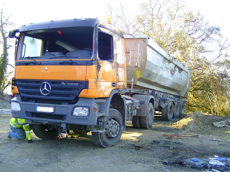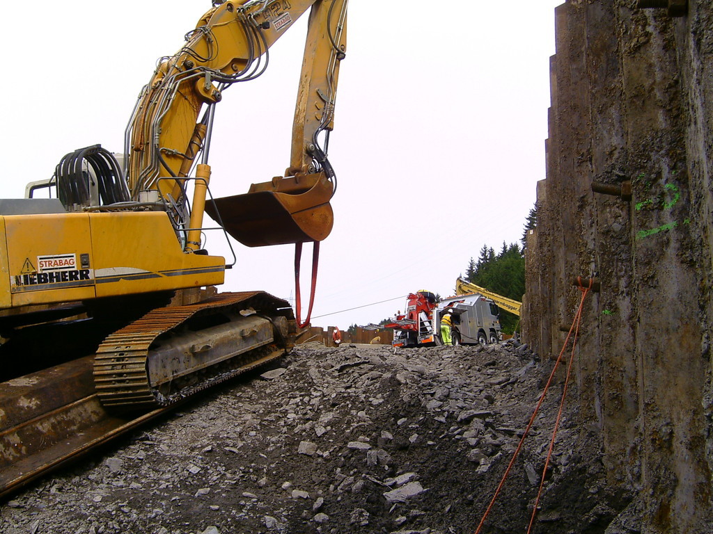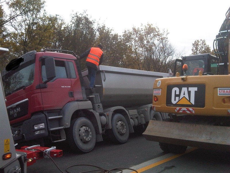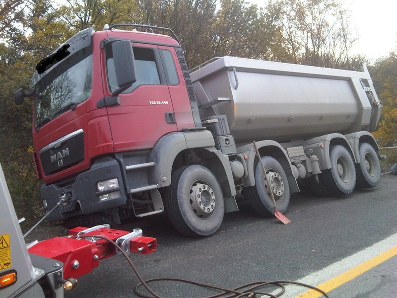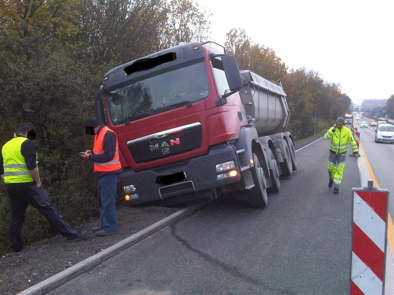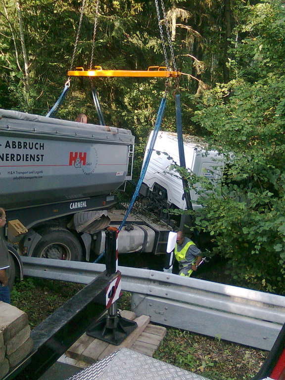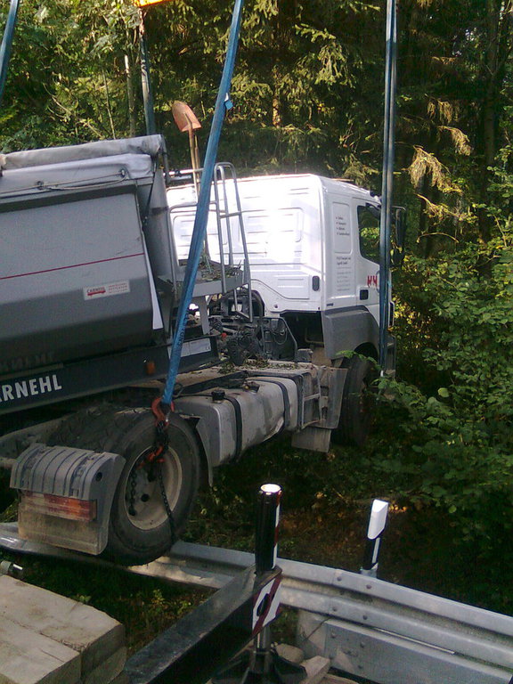 Ein 4-Achser Kipper kam beim Einfahren in den Baustellenbereich auf den geschotterten Randstreifen. Das Fahrzeug hat sich in den Schotter mit der rechten Fahrzeugseite komplett eingegraben und drohte den dahinterliegenden Abhang herunterzustürzen.