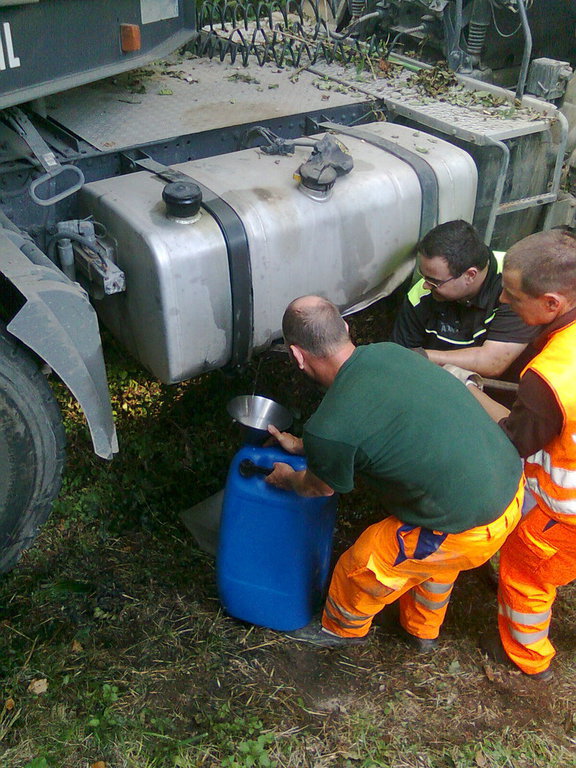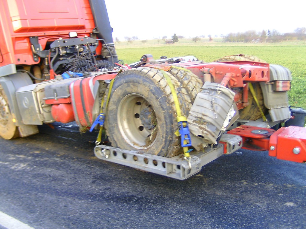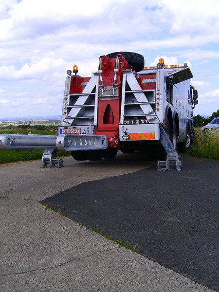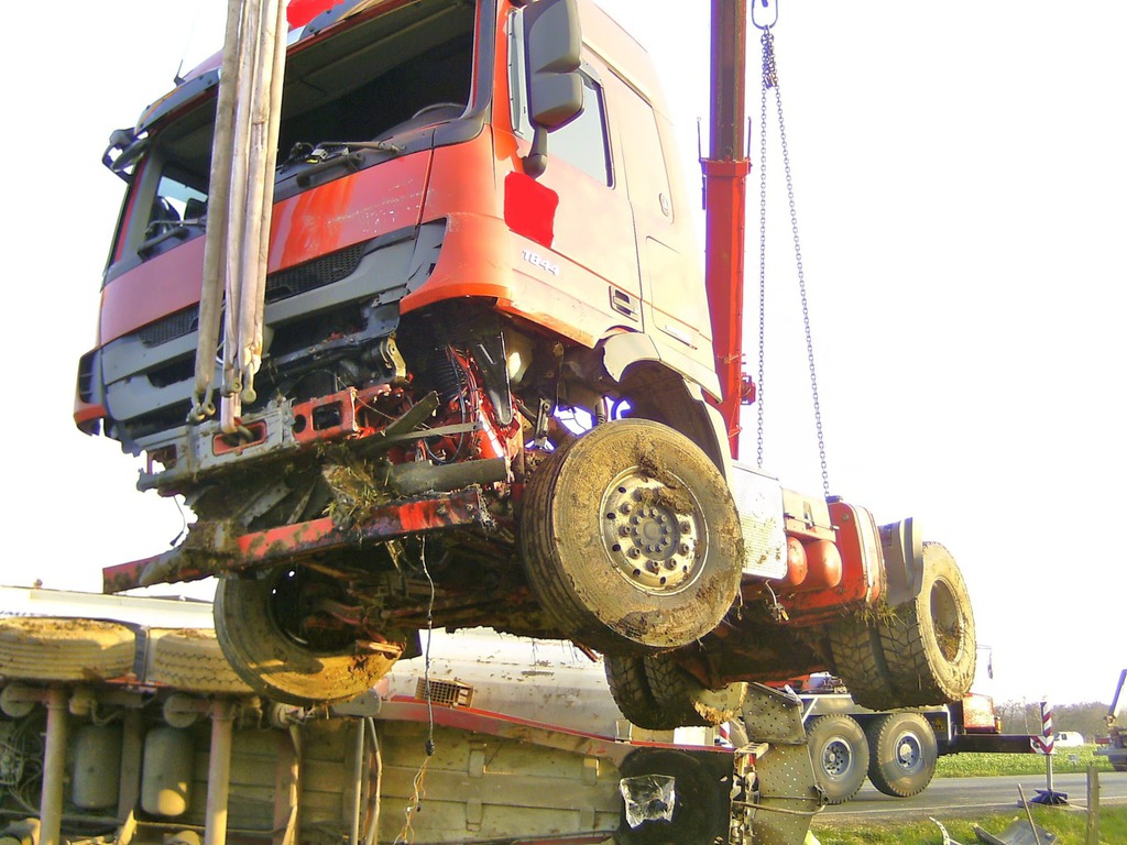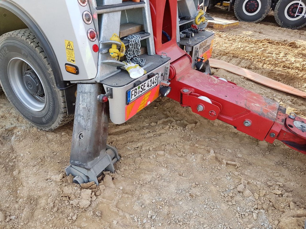 Zunächst wurde das Hydrauliköl abgelassen und in Kanister abgefüllt. Während der Autokran in Bereitschaft stand, wurde mit dem 4-Achser Unterfahrlift mit der Bergung begonnen. Mittels der beiden Seilwinden konnte das Fahrzeug ohne weitere Beschädigungen aufgestellt und abgeschleppt werden.