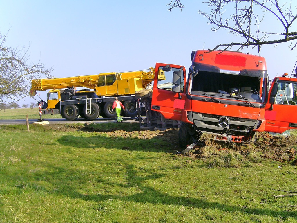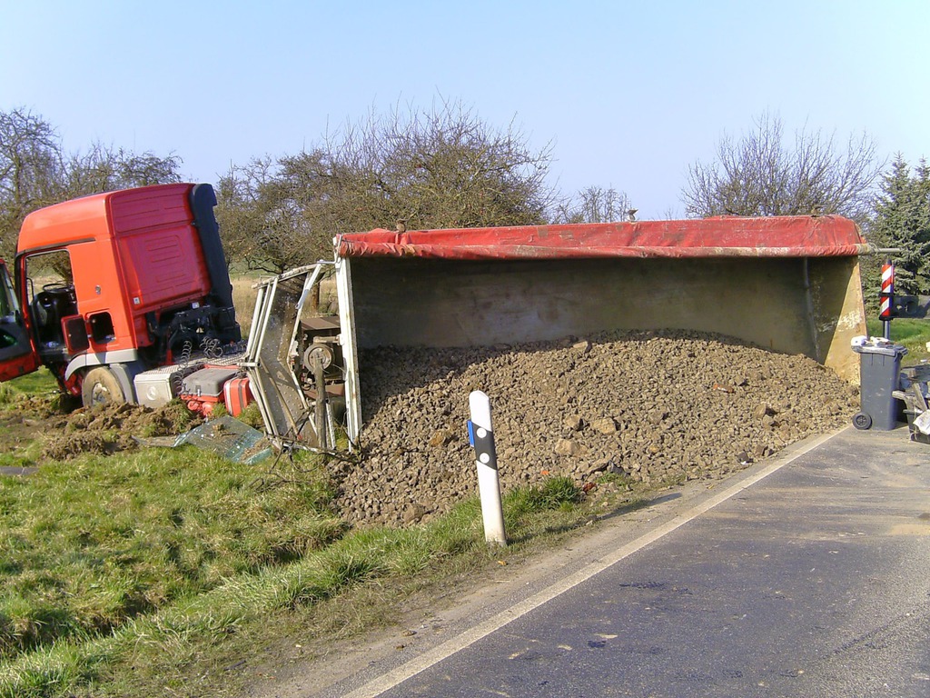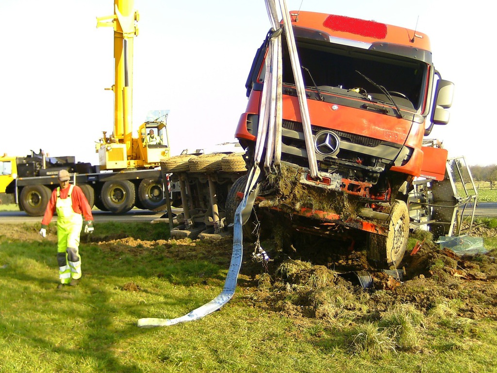 Dadurch kam der Lastwagen von der Fahrbahn ab und grub sich ca. 1 Meter tief in den Boden ein und dabei die Ladung verlor. Mit Absprache der Polizei sowie der Straßenmeisterei wurde die Bergung