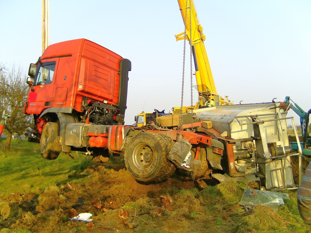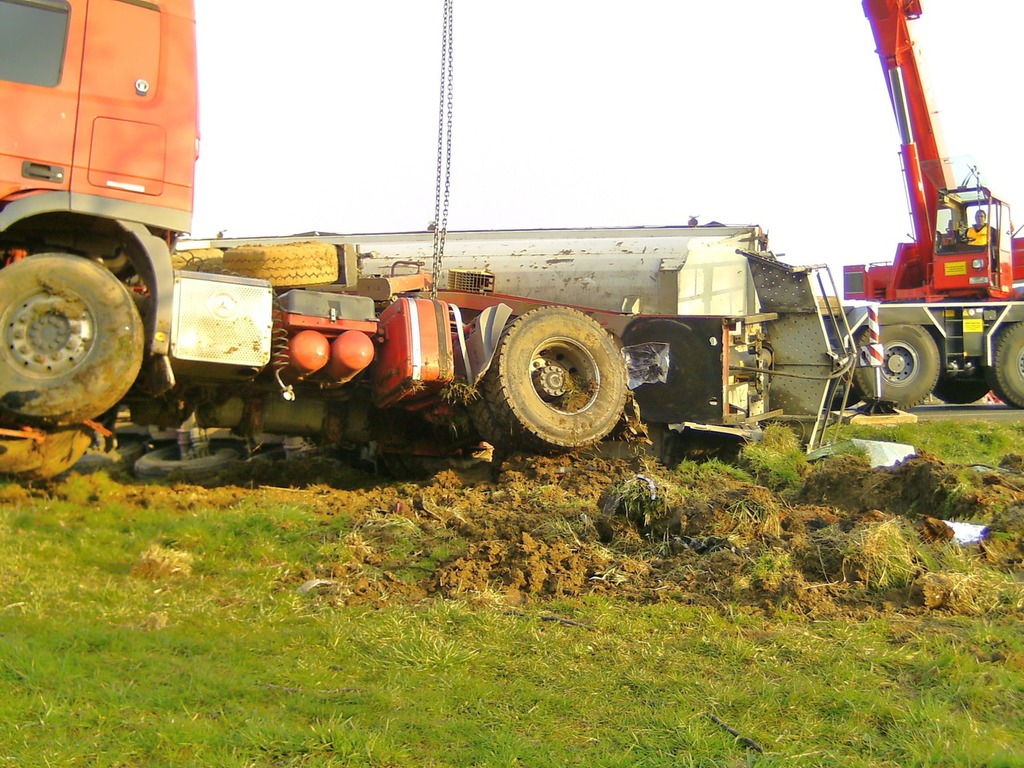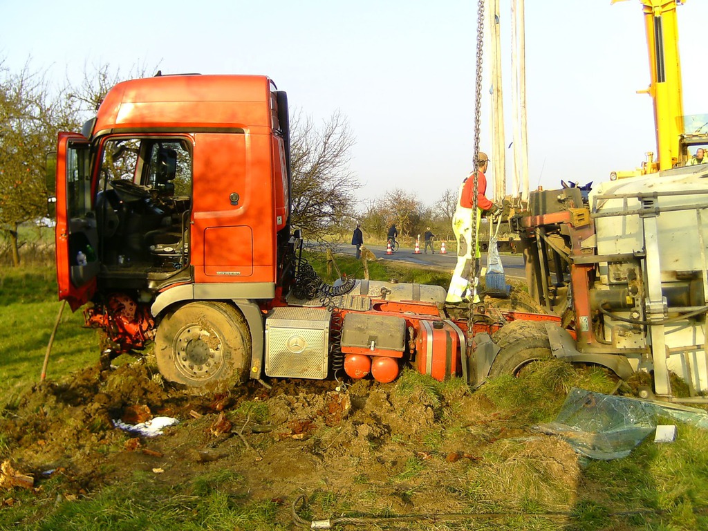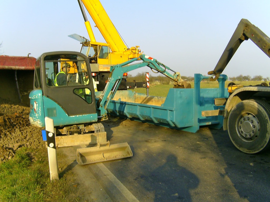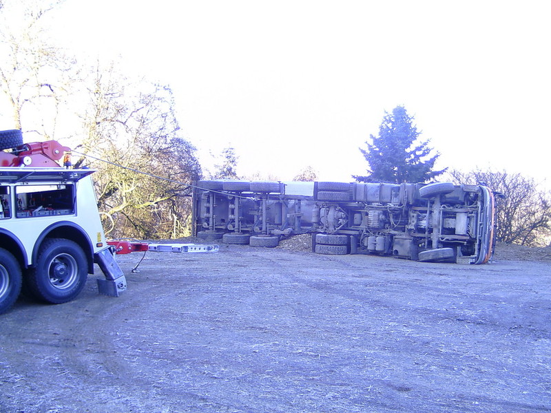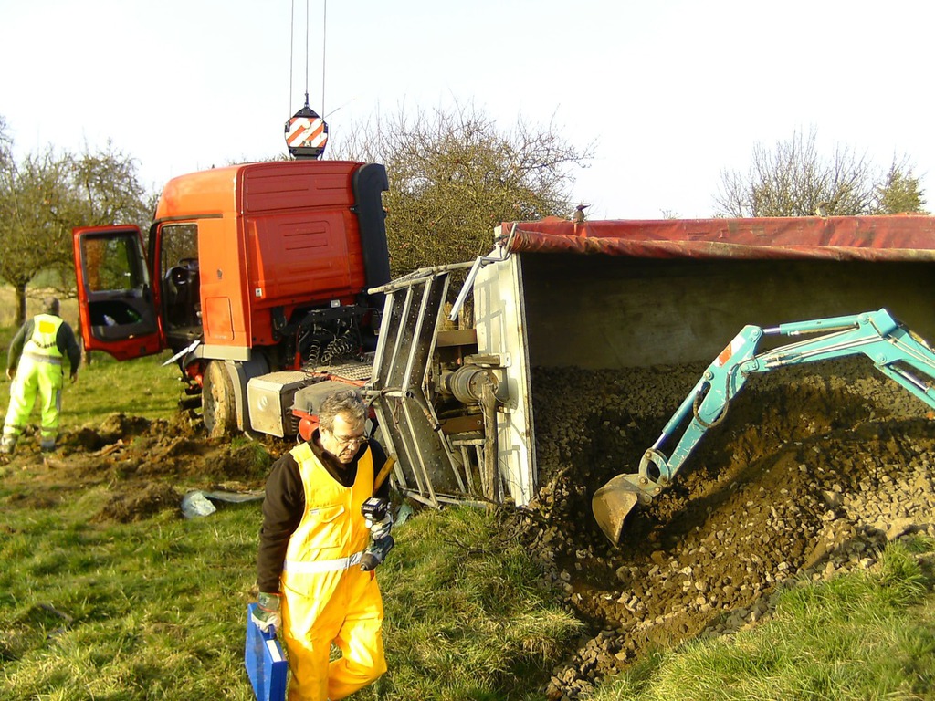 eingeleitet. Zur Bergung wurden zwei Autokrane benötigt, da der LKW mit der Hinterachse unter dem Kipper verklemmt war. Mit Hilfe eines Baggers wurde der Schotter aus dem Kipper und dem Straßengraben