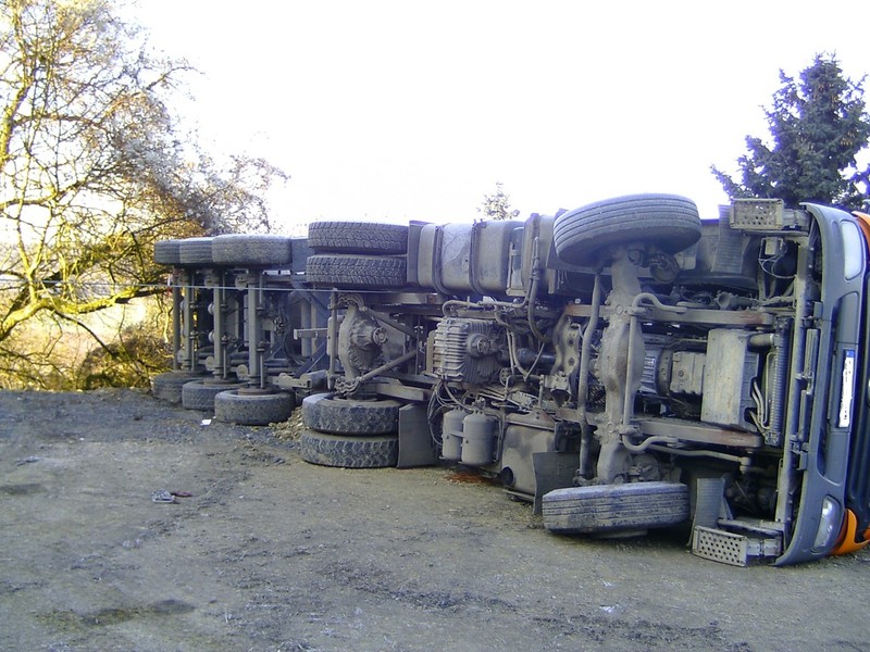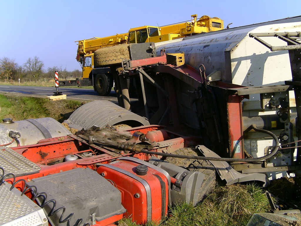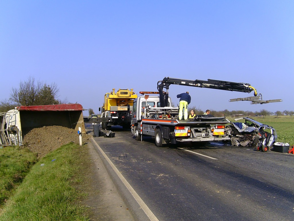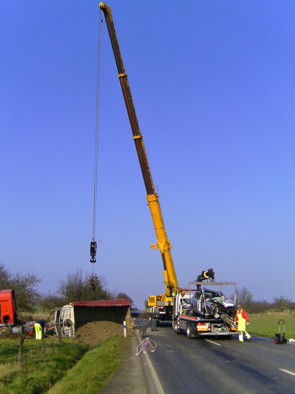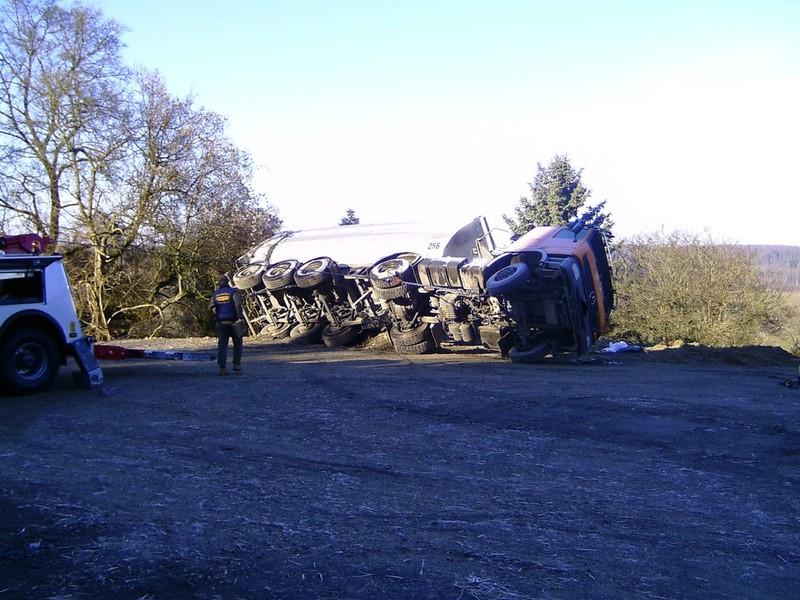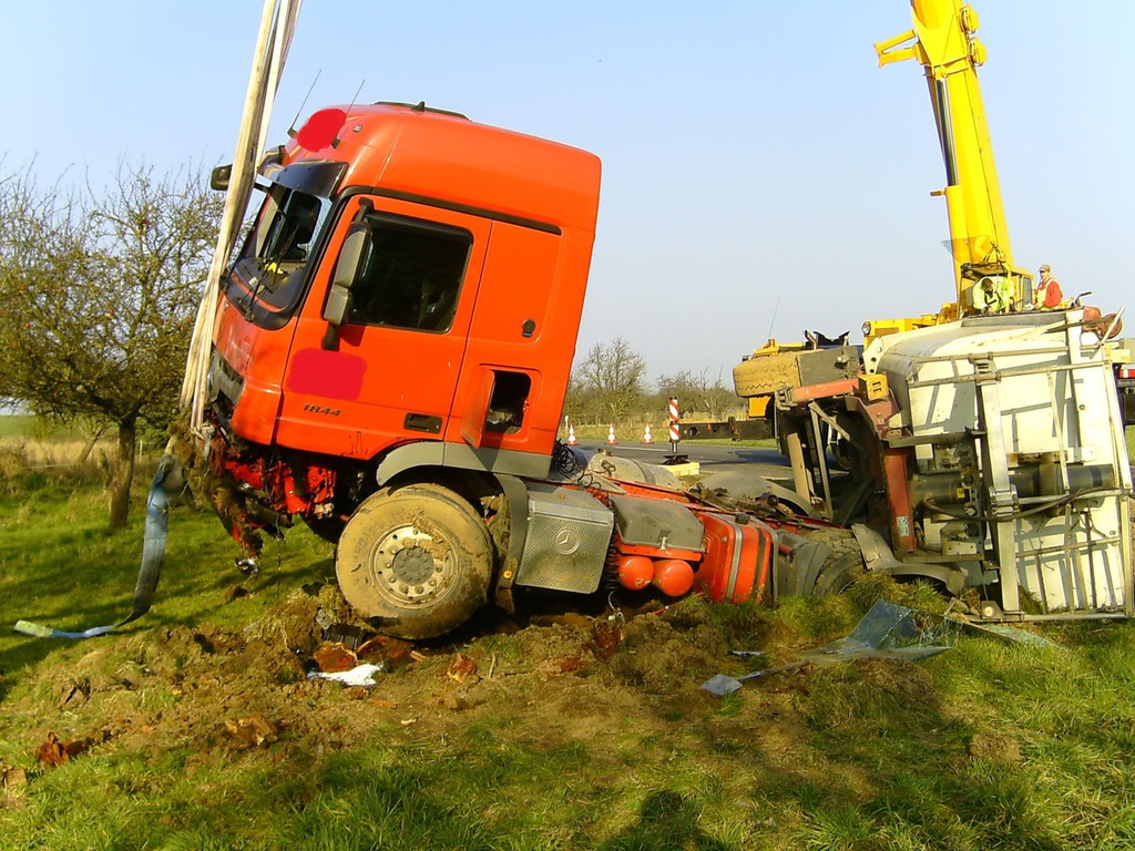 eingeleitet. Zur Bergung wurden zwei Autokrane benötigt, da der LKW mit der Hinterachse unter dem Kipper verklemmt war. Mit Hilfe eines Baggers wurde der Schotter aus dem Kipper und dem Straßengraben