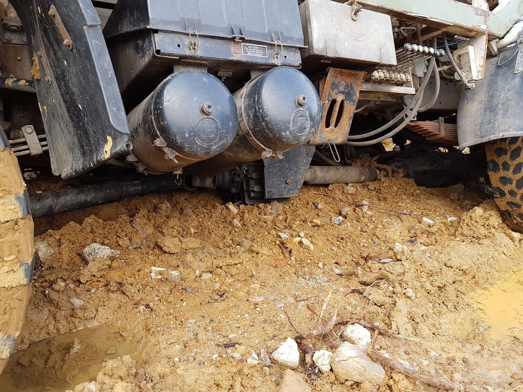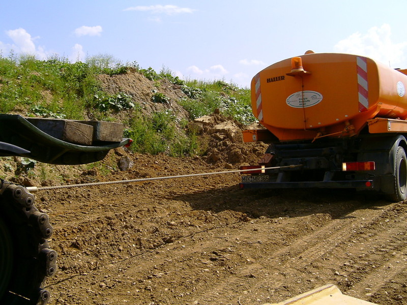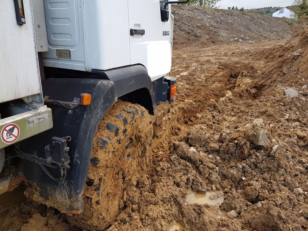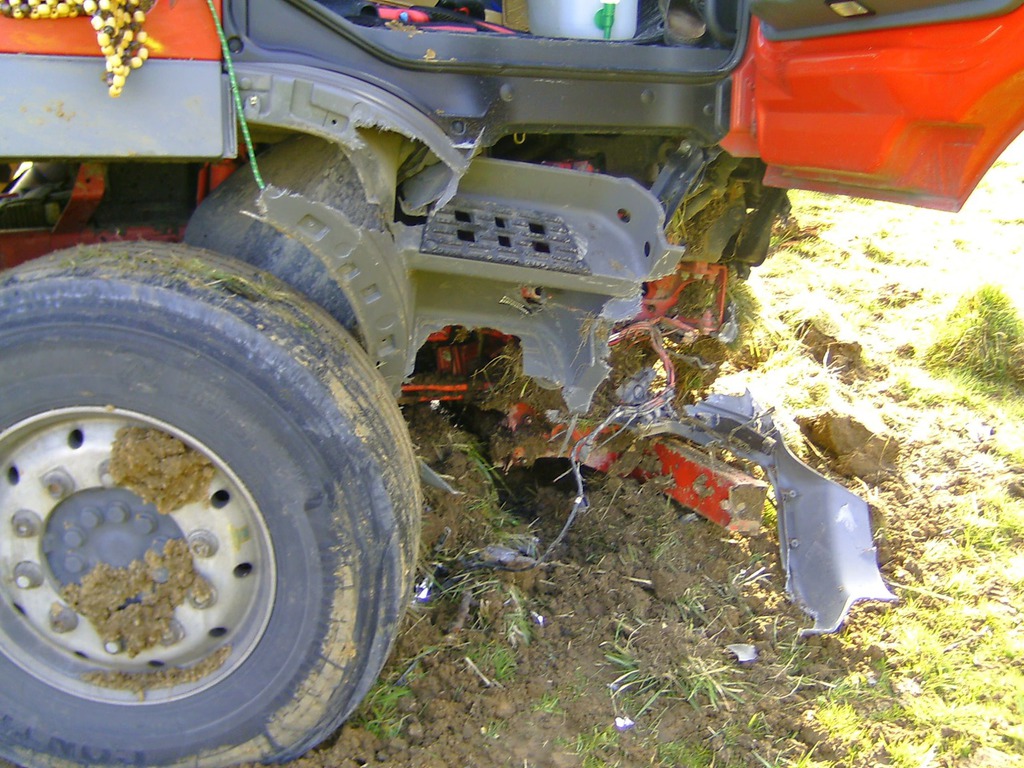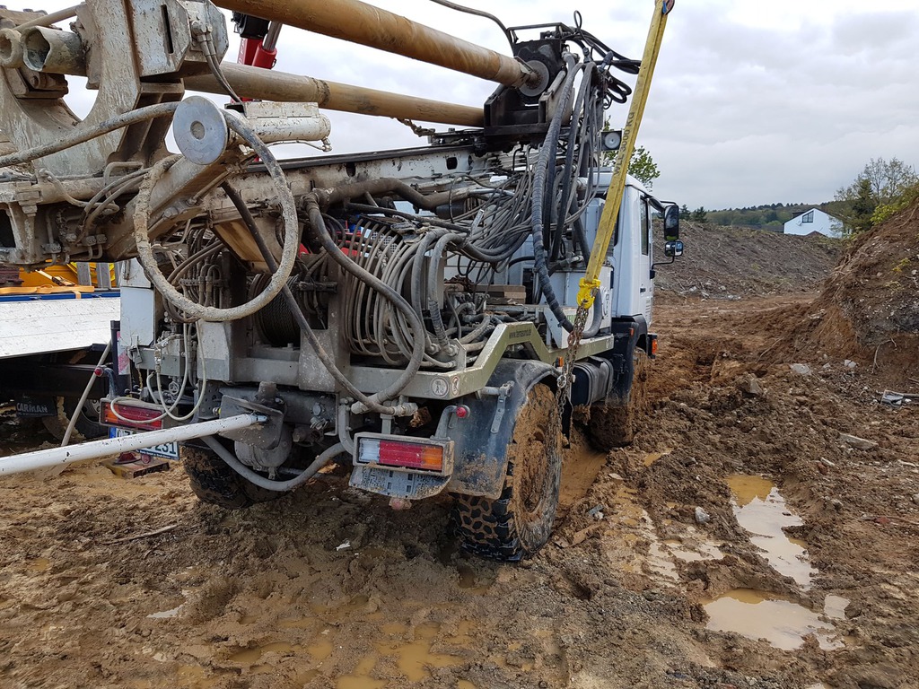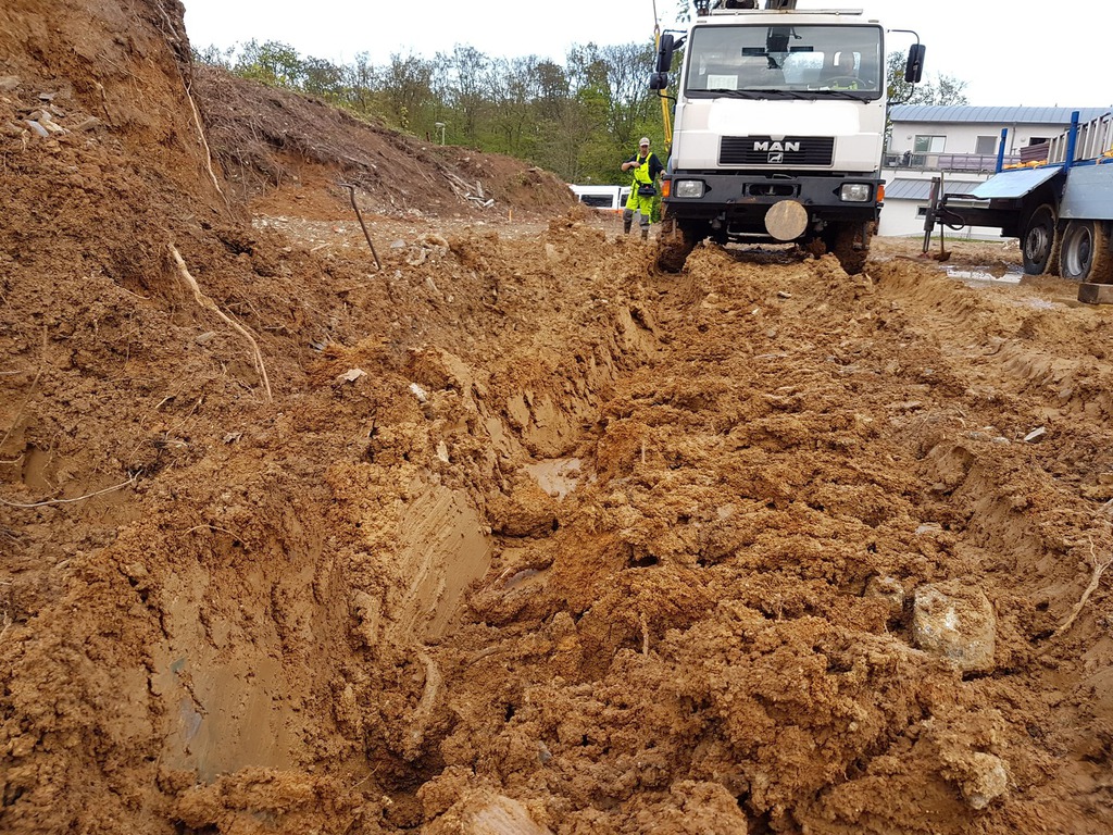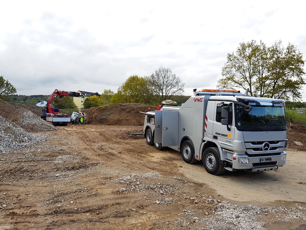 Der Bergeleiter begab sich direkt nach dem Unfall auf Kundenwunsch zur Unfallstelle, um das Fahrzeug und das Gelände zu besichtigen. Das Fahrzeug lag auf der linken Fahrzeugseite im Bereich eines Abhang. Zur Bergung war minimal Platz vorhanden. Mittels eines Baggers wurde der restliche Schotter aus der Mulde gebaggert. Ebenso musste die Fläche um das Fahrzeug begradigt und befestigt werden, um die Zufahrt und Standfläche für den Unterfahrlift zu gewährleisten.