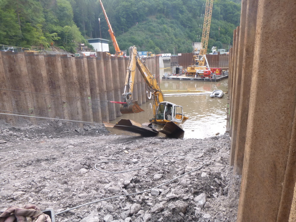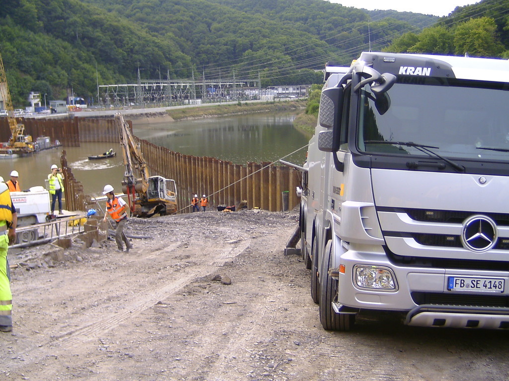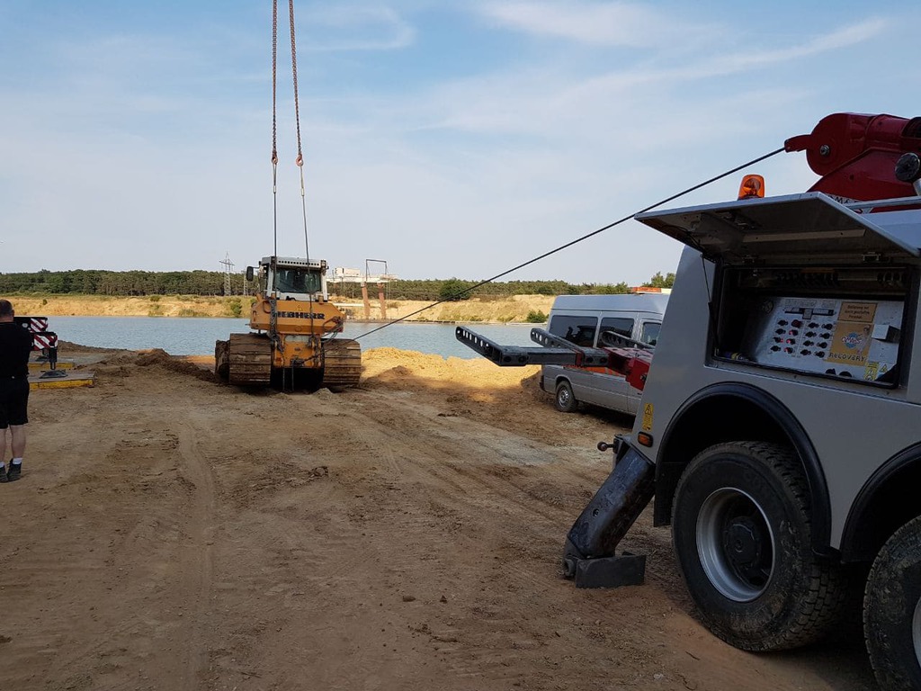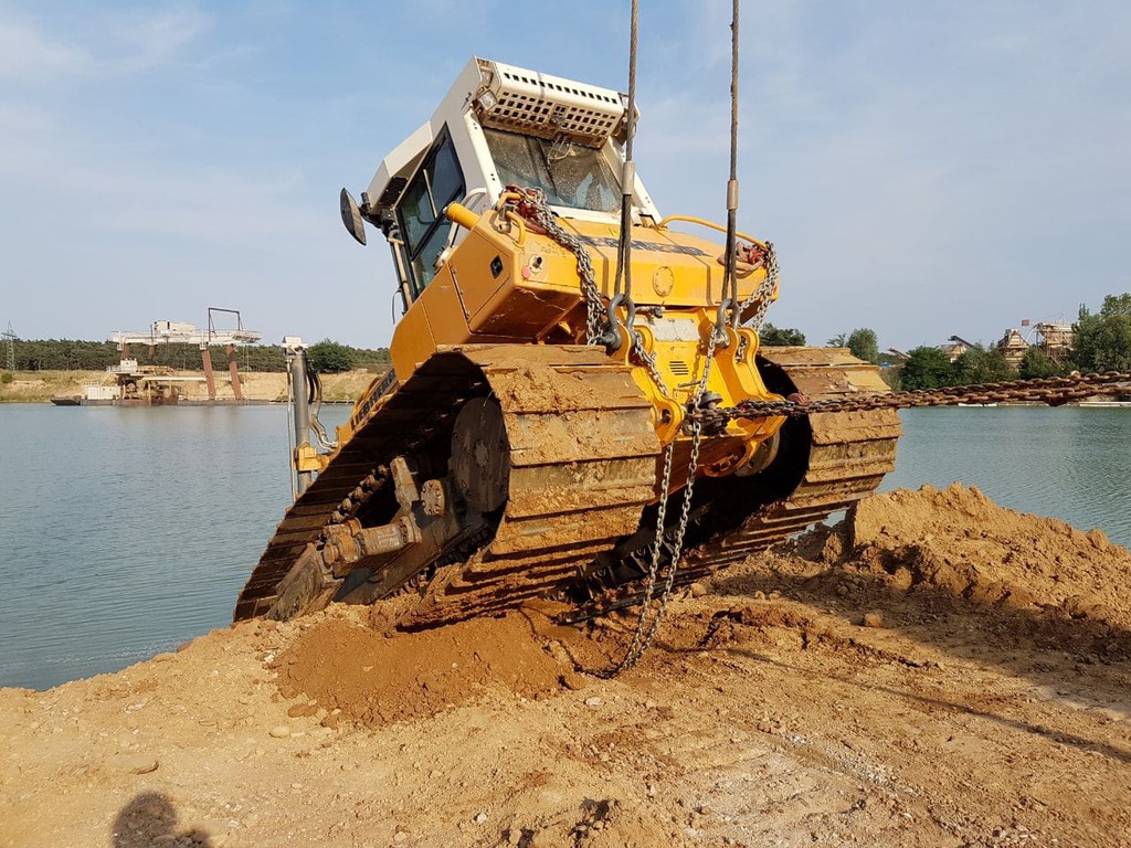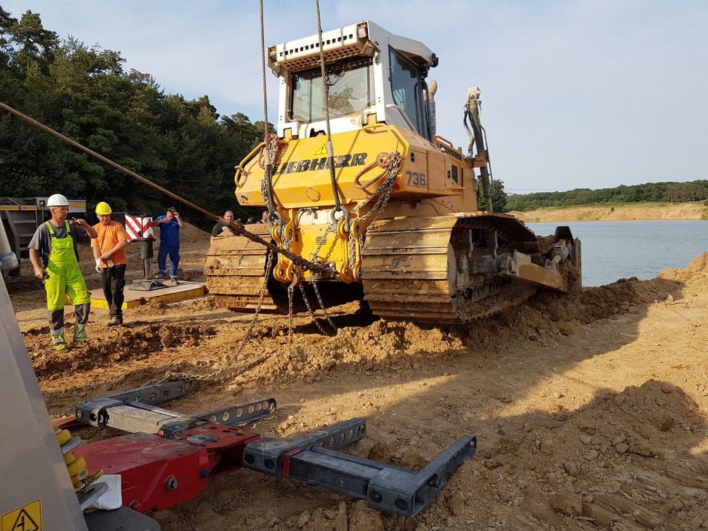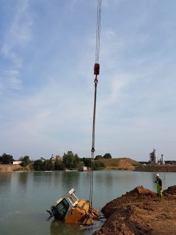 Der Bagger wurde mit Panzeranschlagseilen sowie 30 t Bergewinden im Wasser in eine aufrechte Position gebracht und anschließend aus dem Stausee geborgen.