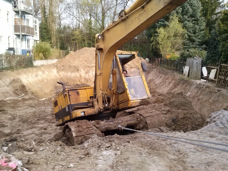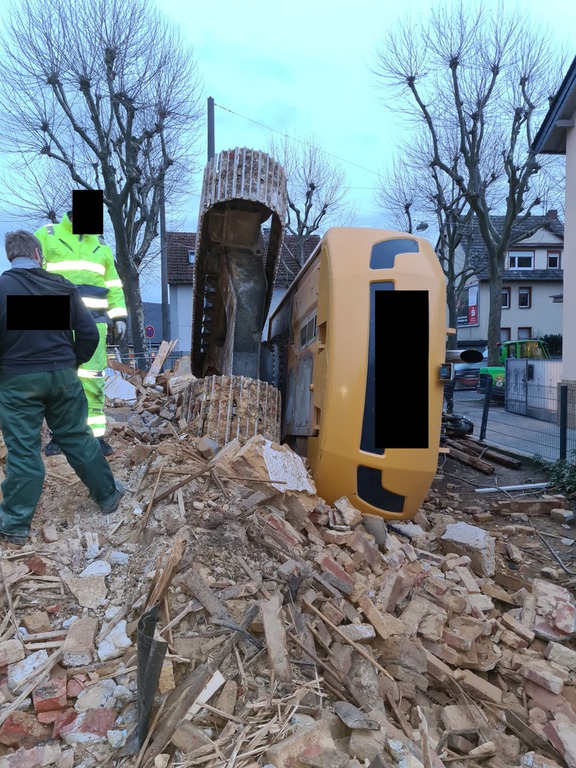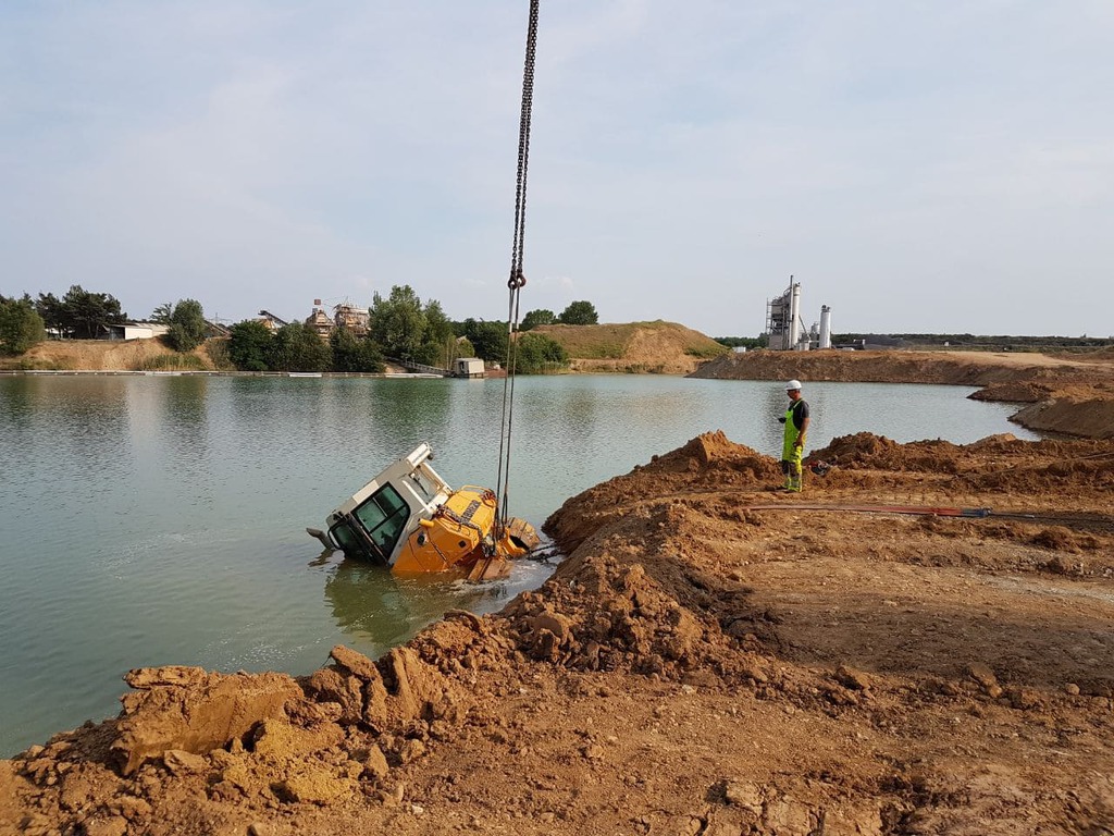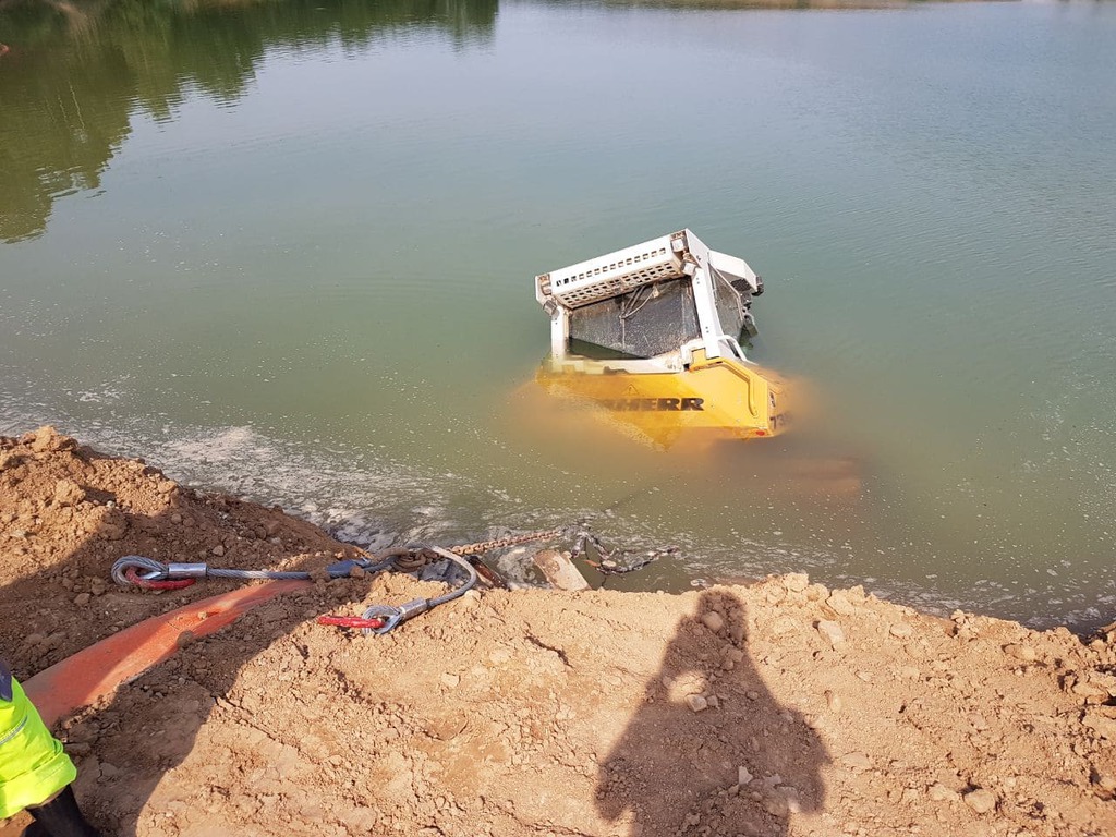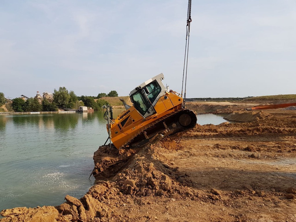Ein 32 t schwerer Bagger kippt kopfüber, mit dem Fahrwerk nach oben, in einen 15 m tiefen Stausee.