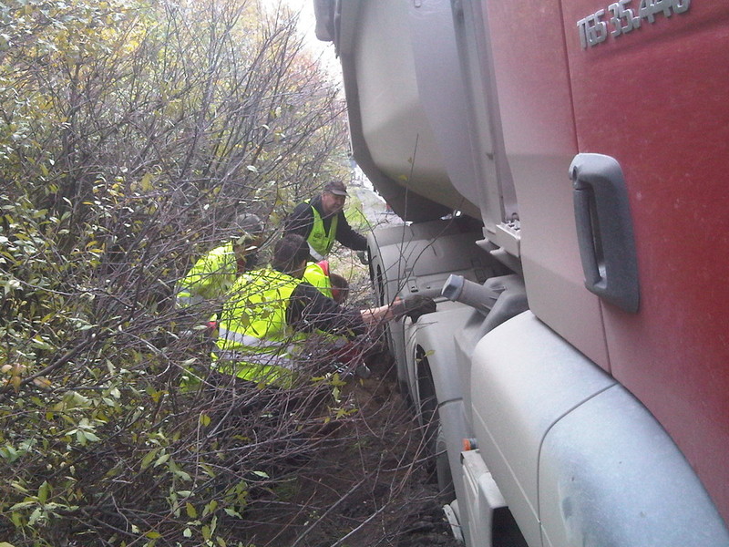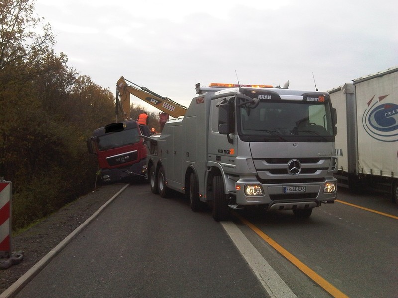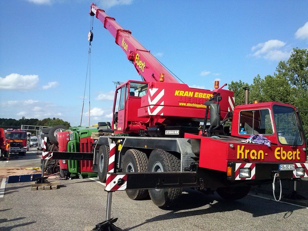 Bei Schotten kam am 8.9.14 ein LKW von der Fahrbahn ab und rutschte die Böschung hinab. Mittels Autokran konnte der Sattelzug ohne Probleme geborgen werden. Durch das gut eingespielte Team war die Bergung eine Spielerei. Gute Kranfahrer muss man halt haben.