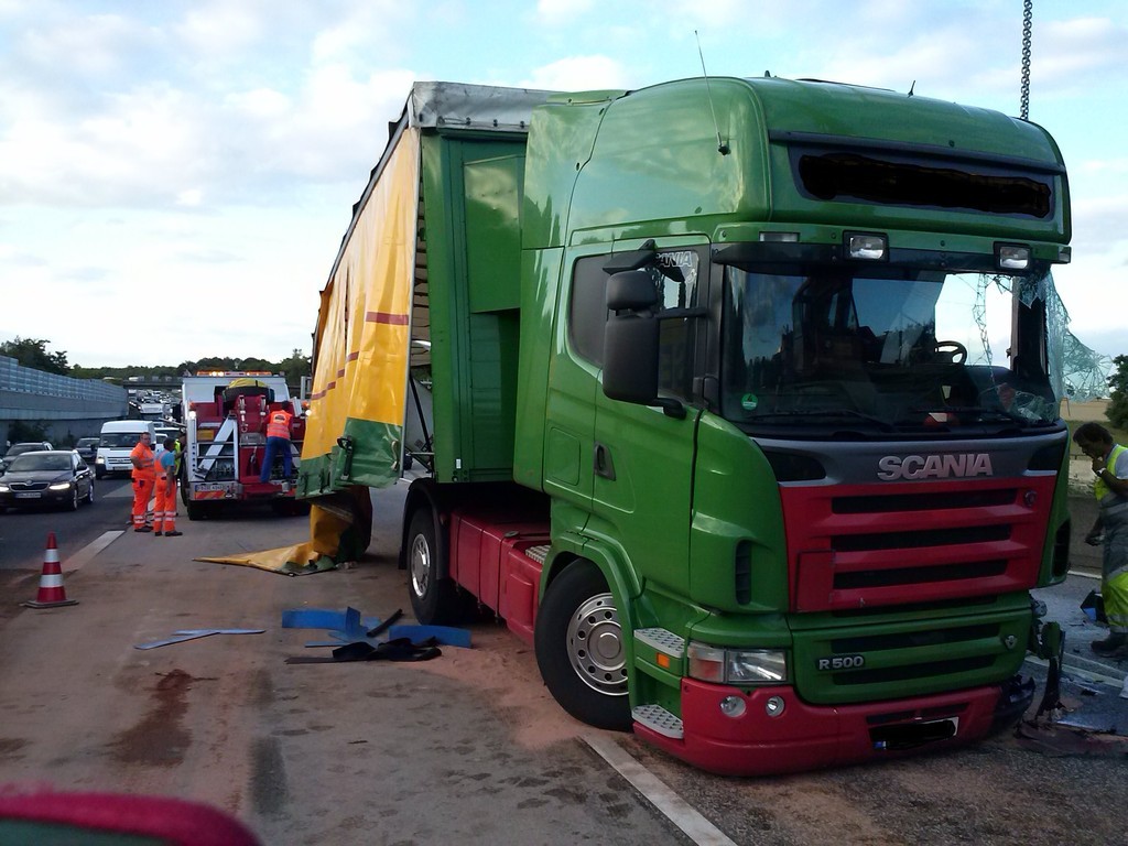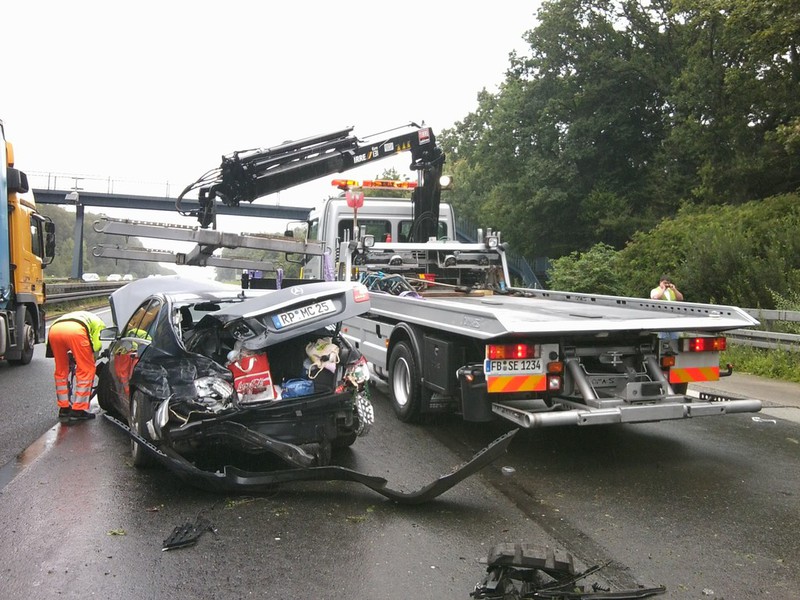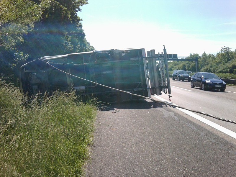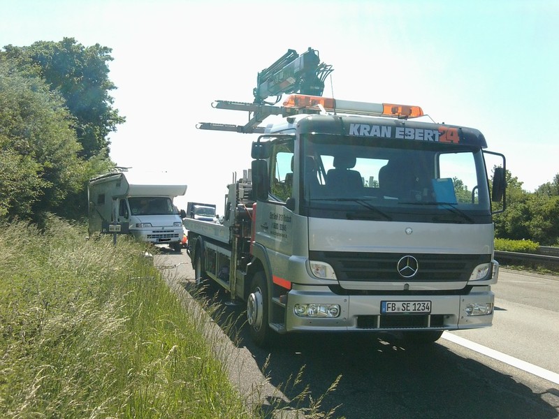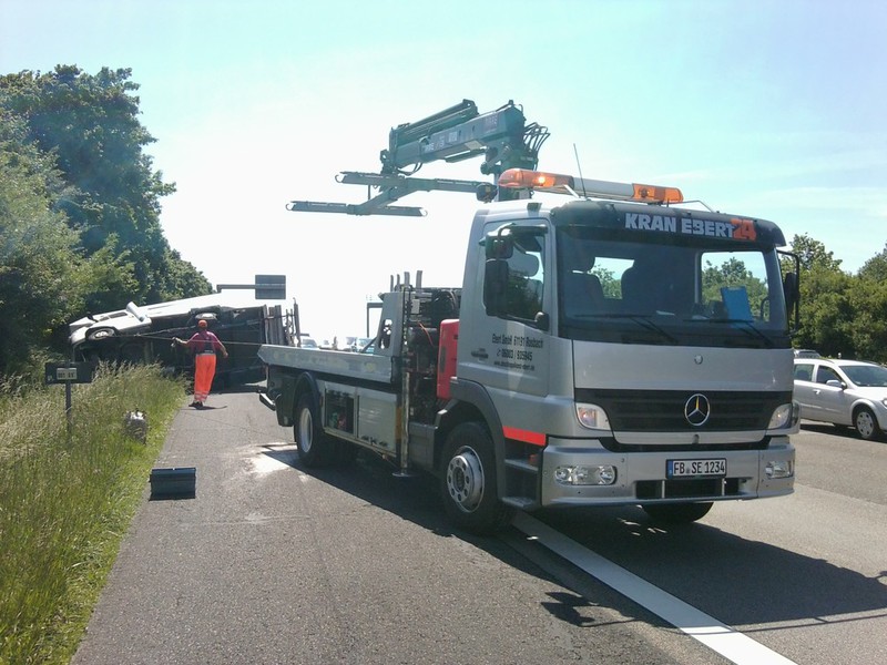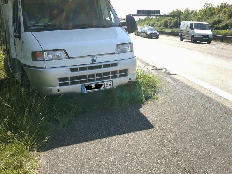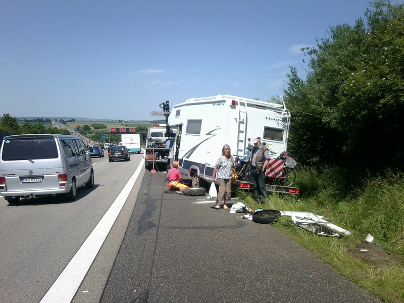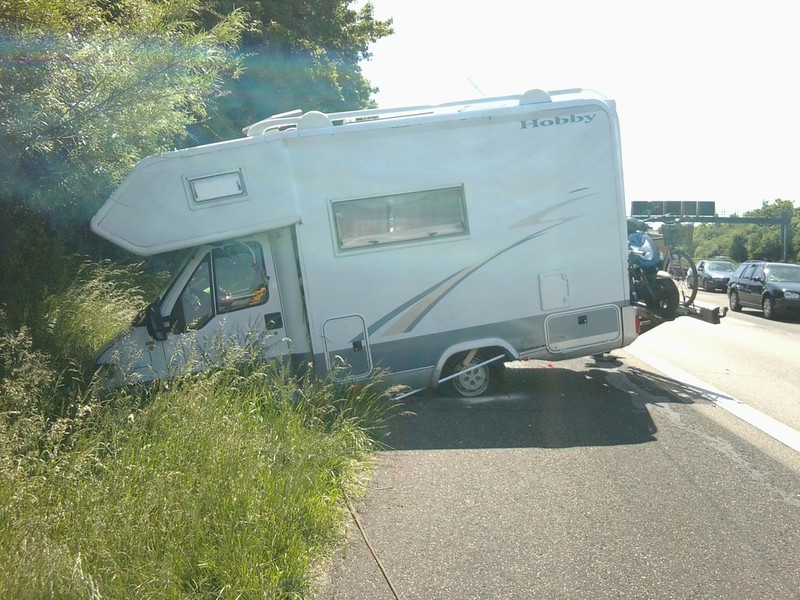 Auf der Heimreise aus dem Schwarzwaldurlaub platze in Höhe der Raststätte Wetterau ein Reifen am etwa 3 Tonnen schweren Wohnmobil. Dabei geriet das Fahrzeug ins Schlingern, fiel auf die Seite und rutsche in den begrünten Seitenstreifen.