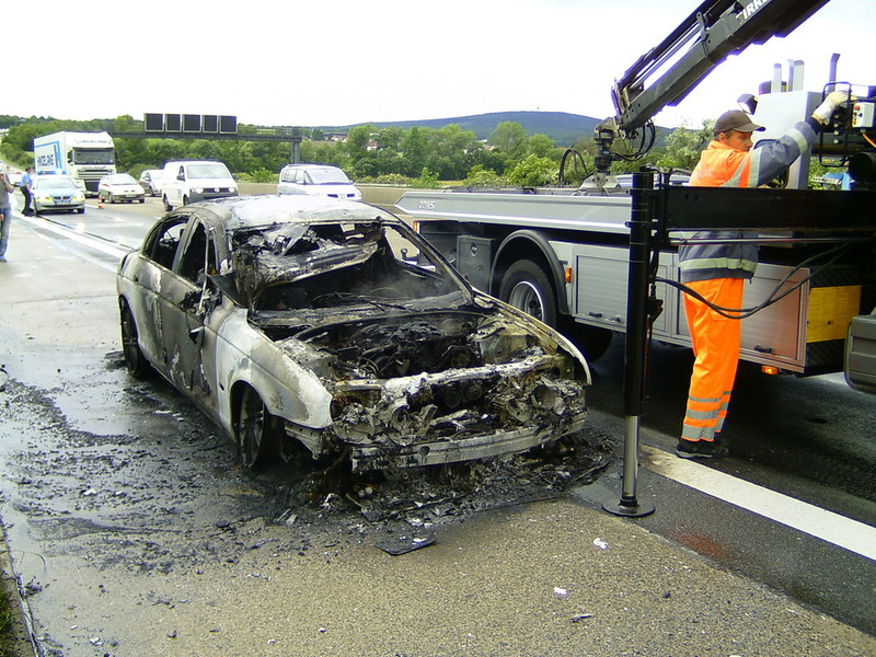 Auf den Nachhauseweg von Frankfurt bemerkte die Fahrerin des Jaguar plötzlich ein lautes Knallen im Motorraum. Ihr Beifahrer stellte hinter dem Fahrzeug eine Rauchentwicklung fest. Daraufhin haben die beiden das Fahrzeug auf dem Seitenstreifen abgestellt und mussten zuschauen wie die Flammen nach und nach auf das komplette Fahrzeug übergriffen.